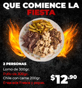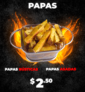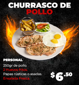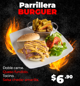 NUESTRO MENÚ ENTRADASSabores únicos para comenzar. BURGUER & ALITASTodas nuestras hamburguesas incluyen papas rústicas o asadas. CARNES AL GRILLTodos nuestros cortes influyen ensalada fresca, chorizo, papas rusticas o asadas. LUNCH & PICADASTodos nuestros platos incluyen guarniciones. EXTRASPORCIONES OPCIONALES DRINKS Limonada Clásica$1.75 Limonada de Coco$1.75 Limonada de Fresa$1.75 Michelada: Clásica/Maracuyá$3.50 Jarra de Jugo: 6 Personas$4.50 Copa de Vino$2.90 Botella de Vino$14.99 Pilsener 1L: Unidad$4.50 Pilsener 1L: 3 Unidades$12.99 Pilsener 650ml: 1 Unidad$3.75 Pilsener 650ml: 3 Unidades$8.99 Club Verde 600ml: 1 Unidad$3.75 Club Verde 600ml: 3 Unidades$10.99 Gaseosa Persoanal$0.80 Salgría: Copa$3.50 Salgría: Jarra$12.50 COCKTAIL BULL SHOT (CERVEZA Y TEQUILA)CERVEZA PILSENER PEQUEÑA – ZUMO DE LIMÓNJUGO DE NARANJA.$5.99 MARGARITA (CLÁSICO FRUTOS ROJOS)TEQUILA – ZUMO DE LIMÓN – TRIPLE SEC – JARABE DE AZÚCARHIELO – SABORES A ESCOGER.$6.99 PITBULL PARA COMPARTIRRON BLANCO – VODKA – TEQUILACERVEZA CLUB 650 ml.$14.99 PIÑA COLADARON BLANCO – LICOR DE COCO – LECHE CONDENSADA – PULPADE PIÑA – AGUA – ALMIBAR – HIELO.$4.99 MOJITO CLASICO-FRUTOS ROJOS-MARACUYÁRON BLANCO – HIERBA BUENA – SPRITE – HIELOAZÚCAR – SABORES A ELEGIR.$3.99 CHELADAZUMO DE LIMÓN – PIMIENTA NEGRA – SAL CERVEZA.$2.99 PADRINOWISKY – AMARETO – CEREZAHIELO.$5.95 COFFEE AMARETTORON BLANCO – AMARETO – HIELO – JARABE DE AZUCARCAFE EXPRESO – CHANTILLY – CAFE GRANO.$5.50 TRIPLE SECRON BLANCO – TRIPLE SECZUMO DE LIMON.$6.50 DAIKIRI (FRESA O MARACUYA)RON BLANCO – TRIPLE SEC – ZUMO DE LIMONPULPA DE FRUTA SABOR A ELEGIR – JARABE DE AZUCAR.$6.00 JAGERBOOMJAGERMEINSTER – TRIPLE SEC – ZUMO DE LIMONHIELO FRAPE – REDBULL.$6.90 MOSCOW MULEVODKA – ZUMO DE LIMA Y GENGIBRE – HIELO JARABE DE AZUCAR.$6.95 RULETA SHOT 12FUEGO QUE SORPRENDE.$10.90 RULETA SHOT 6 STAR FIRE$6.90 GOURMET REDZUMO DE LIMON – RON BLANCO – GRANADINA.$4.99